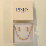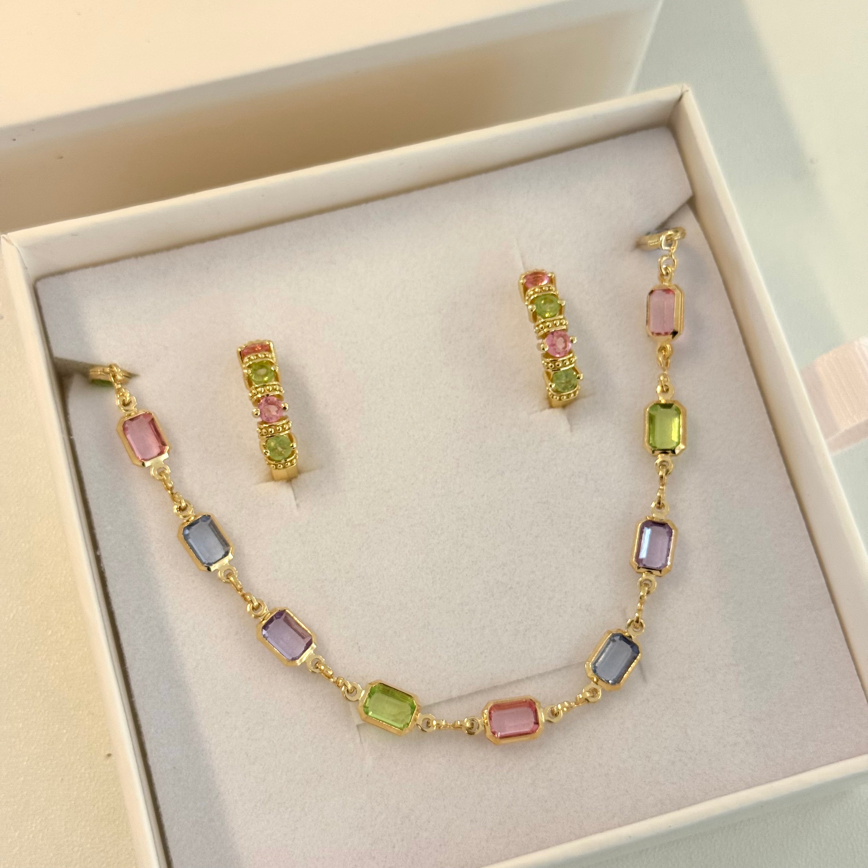 The Solara set combines peridot and pink tourmaline hoops and stunning pastel gemstone necklace to celebrate nature's most enchanting colour palette. Imagine fresh, peridot green alternating with soft, romantic pink tourmaline—each semi-precious gemstone catching the light as you move.